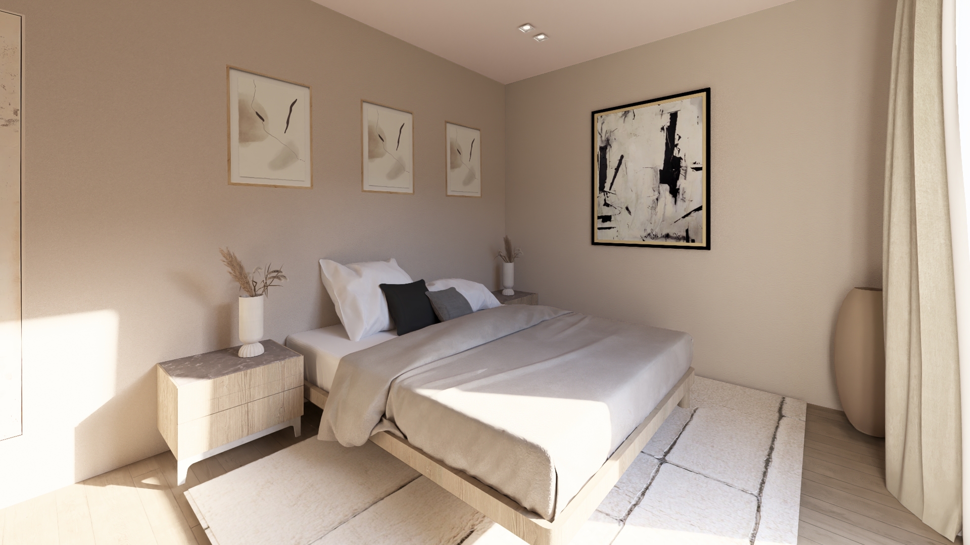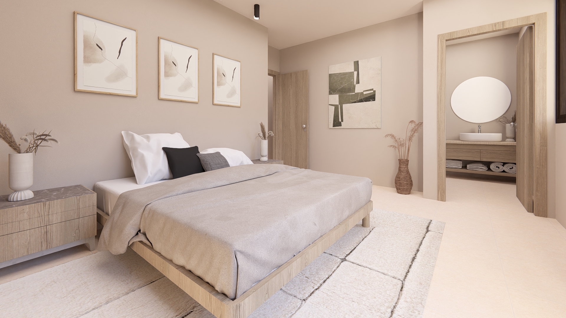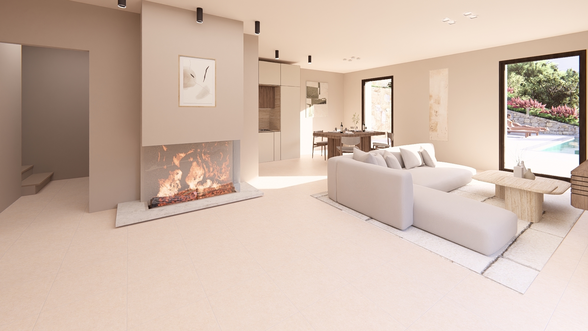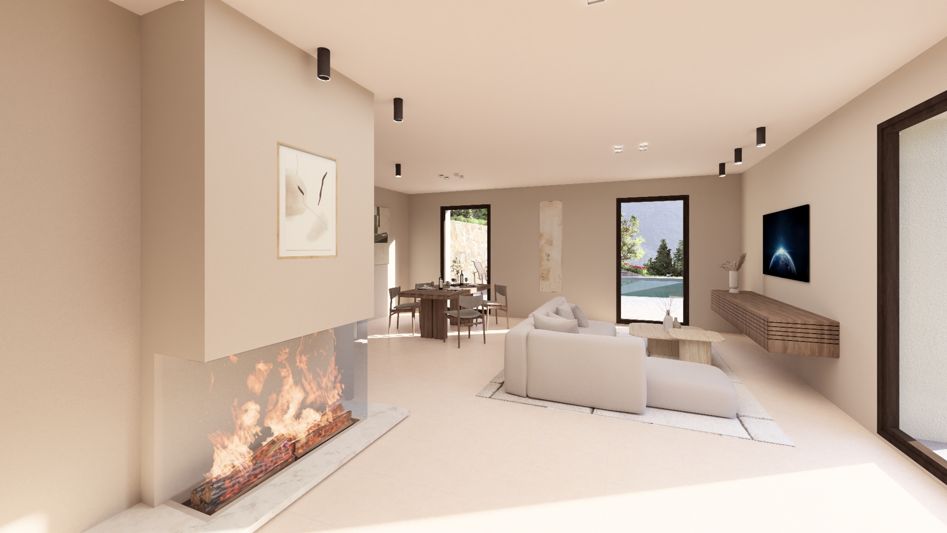 The interior consists of a large living room with fireplace and an open kitchen with dining room giving direct access to the swimming pool. Two en-suite bedrooms and a guest toilet occupy the ground floor, while upstairs, an en-suite bedroom enjoys a private terrace with stunning views.