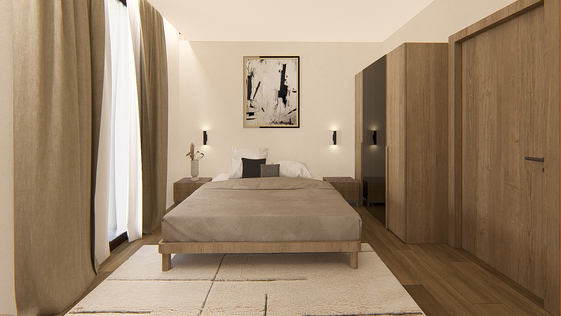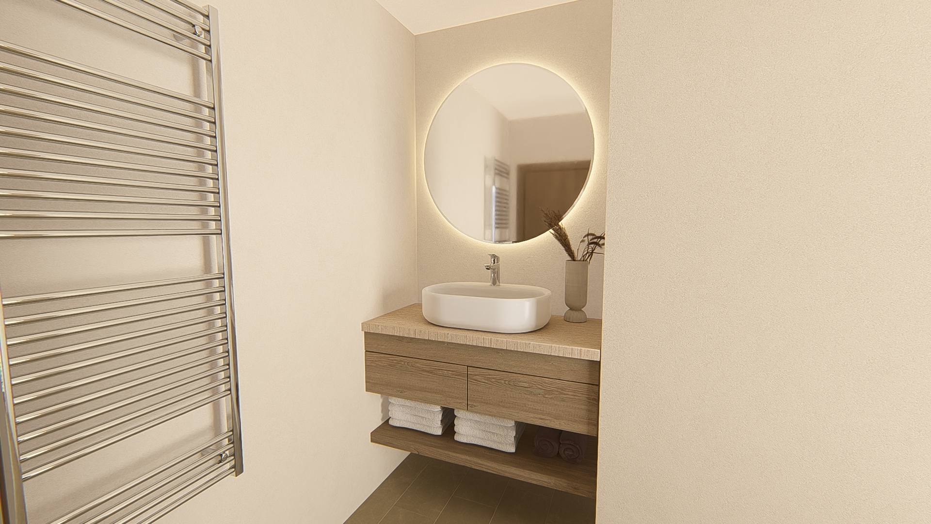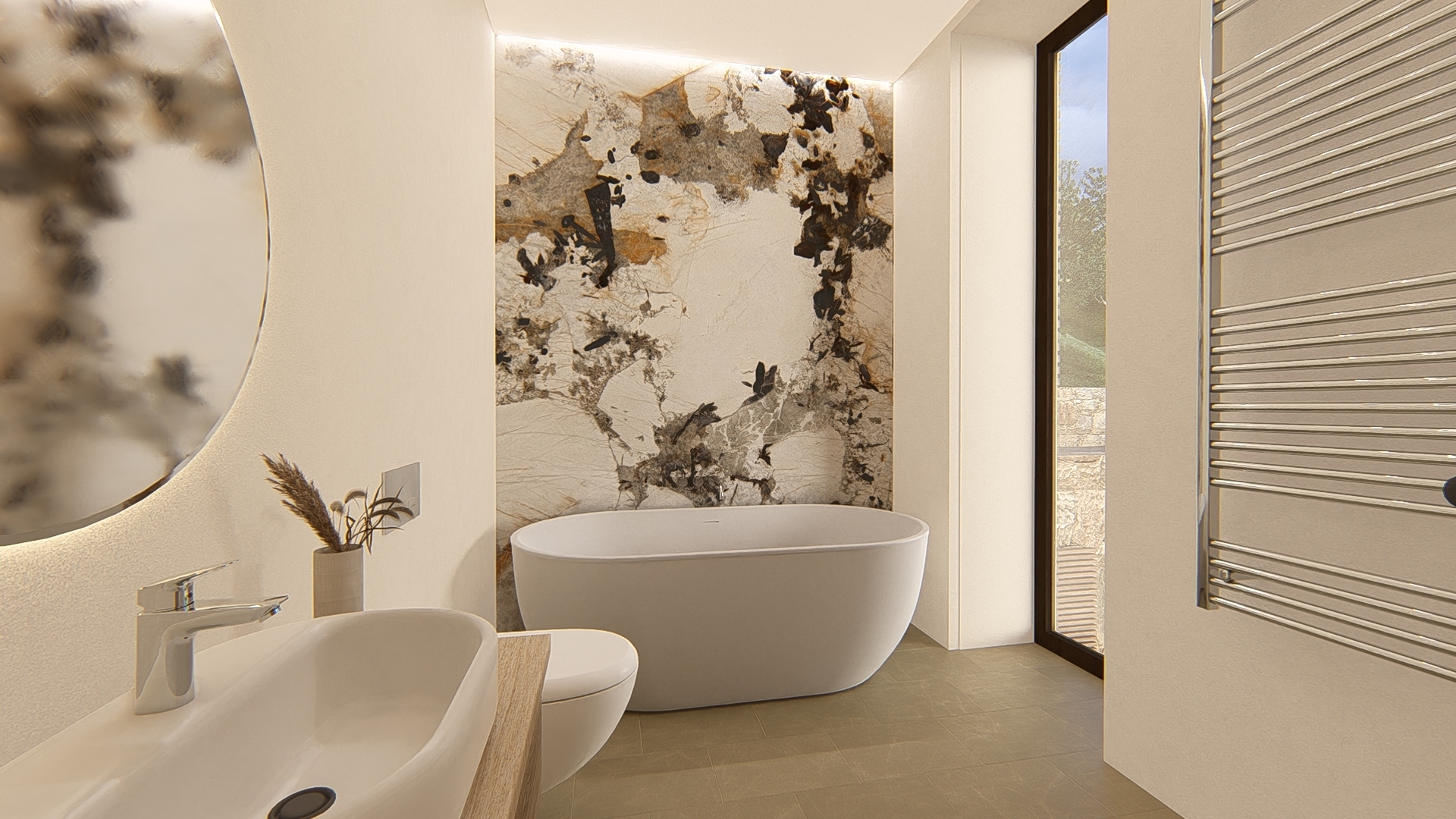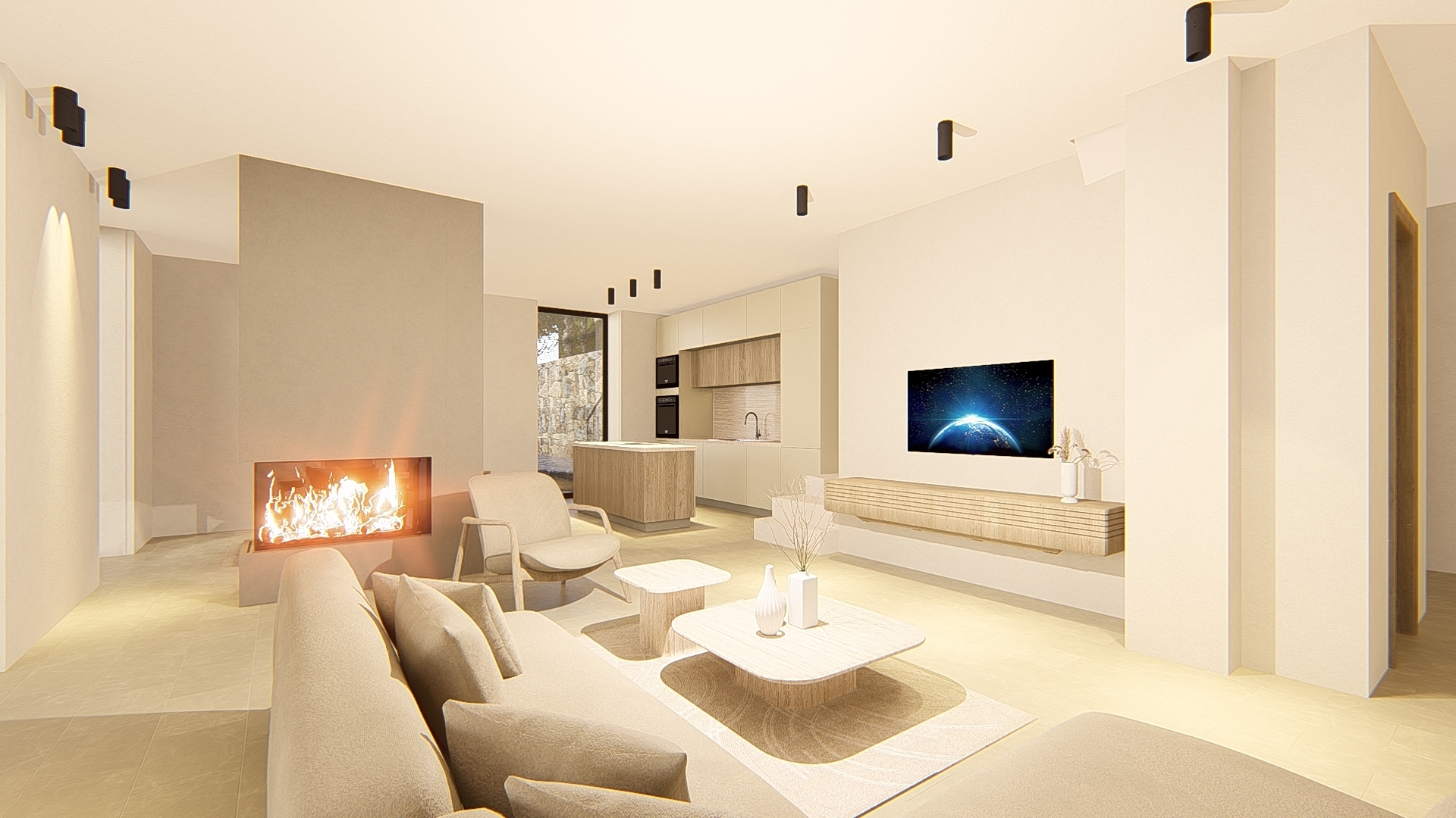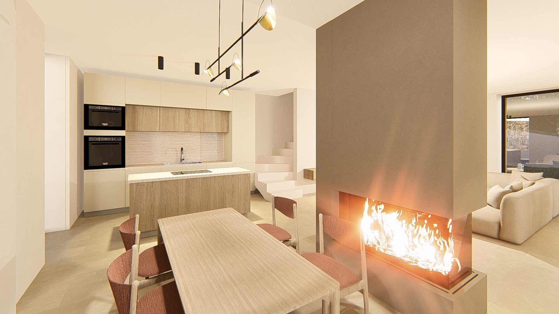 Dall'ingresso, un ampio e luminoso soggiorno con camino si apre su una cucina contemporanea e funzionale, che offre accesso diretto alla piscina e agli spazi esterni. Questo livello ospita anche una camera da letto con bagno privato, con bagno privato e un bagno per gli ospiti.